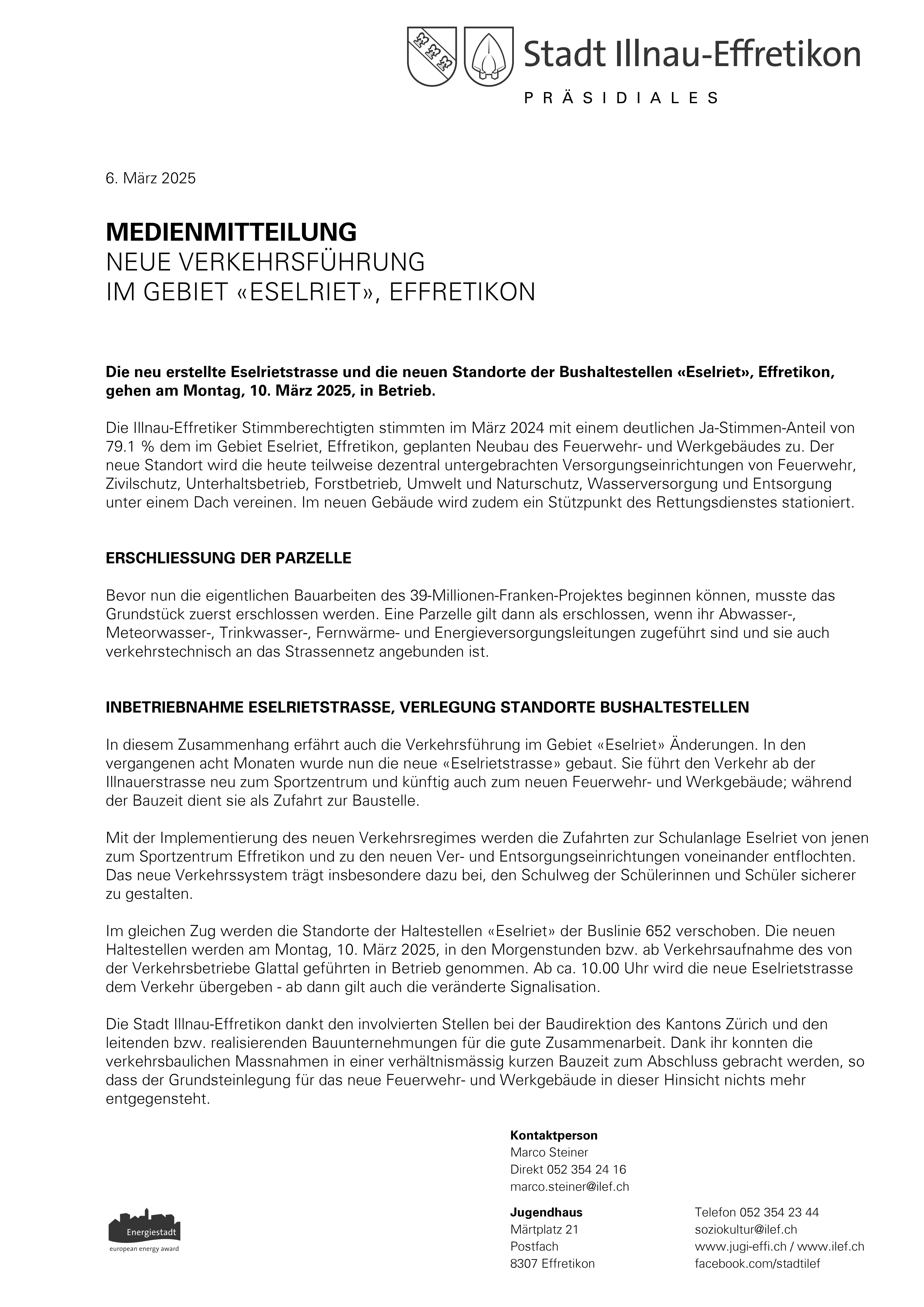 Die Stadt Illnau-Effretikon ist seit 1998 Trägerin des Energiestadt-Labels. Für ihre kontinuierlichen Anstrengungen, eine nachhaltige Energiepolitik zu verfolgen, wurde ihr 2021 der Energiestadt-Gold-Status verliehen. Nun hat sie ihre Bestrebungen weiter ausbauen können und schnitt bei der diesjährigen Rezertifizierung überdurchschnittlich gut ab. Sie erlangt das Gold-Label mit Bestnoten.
