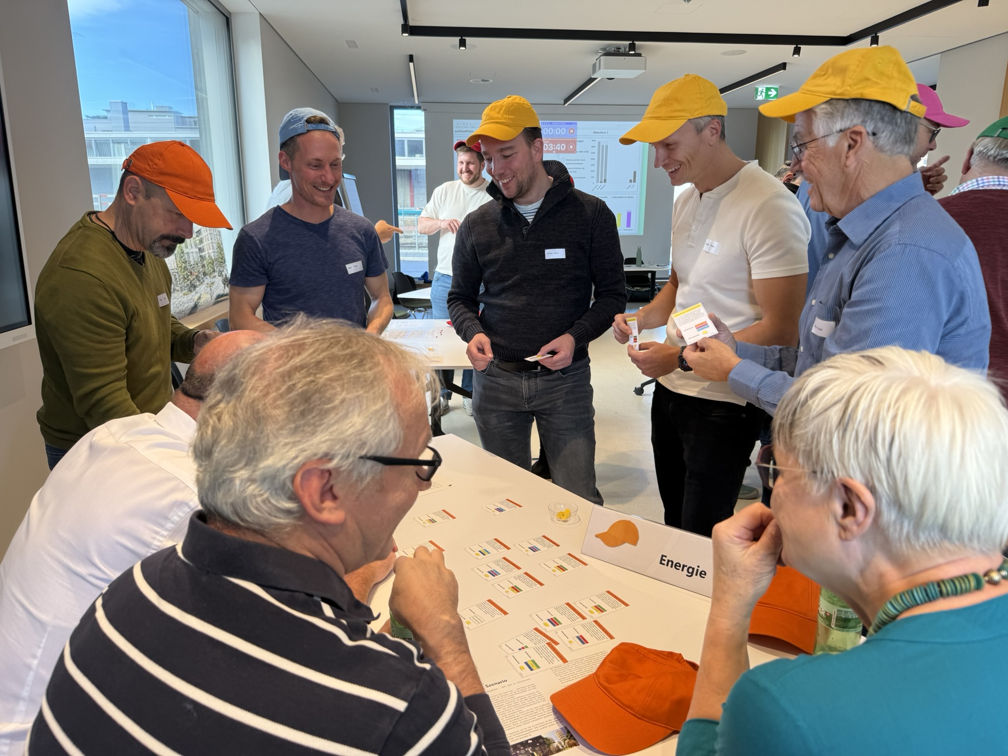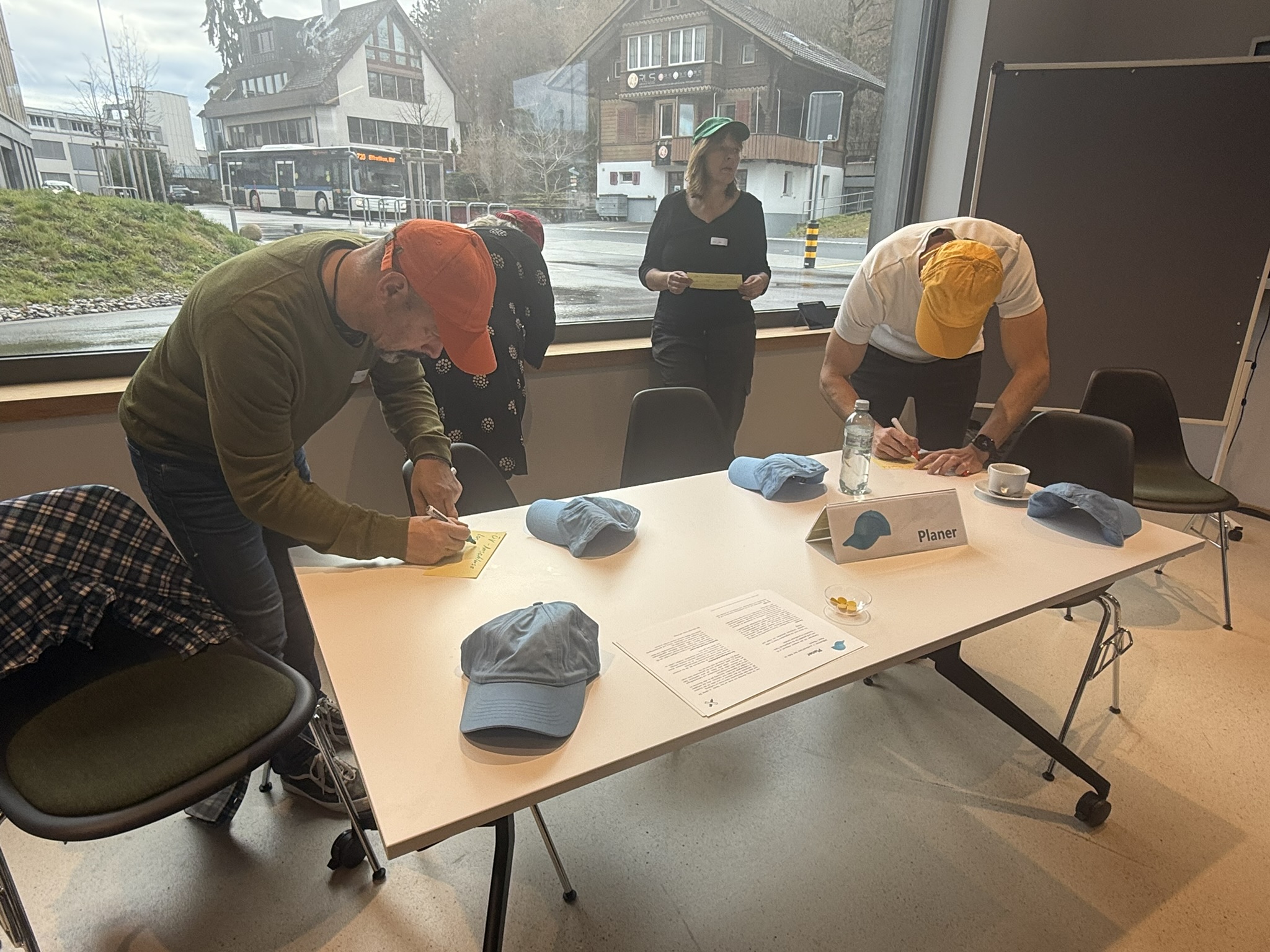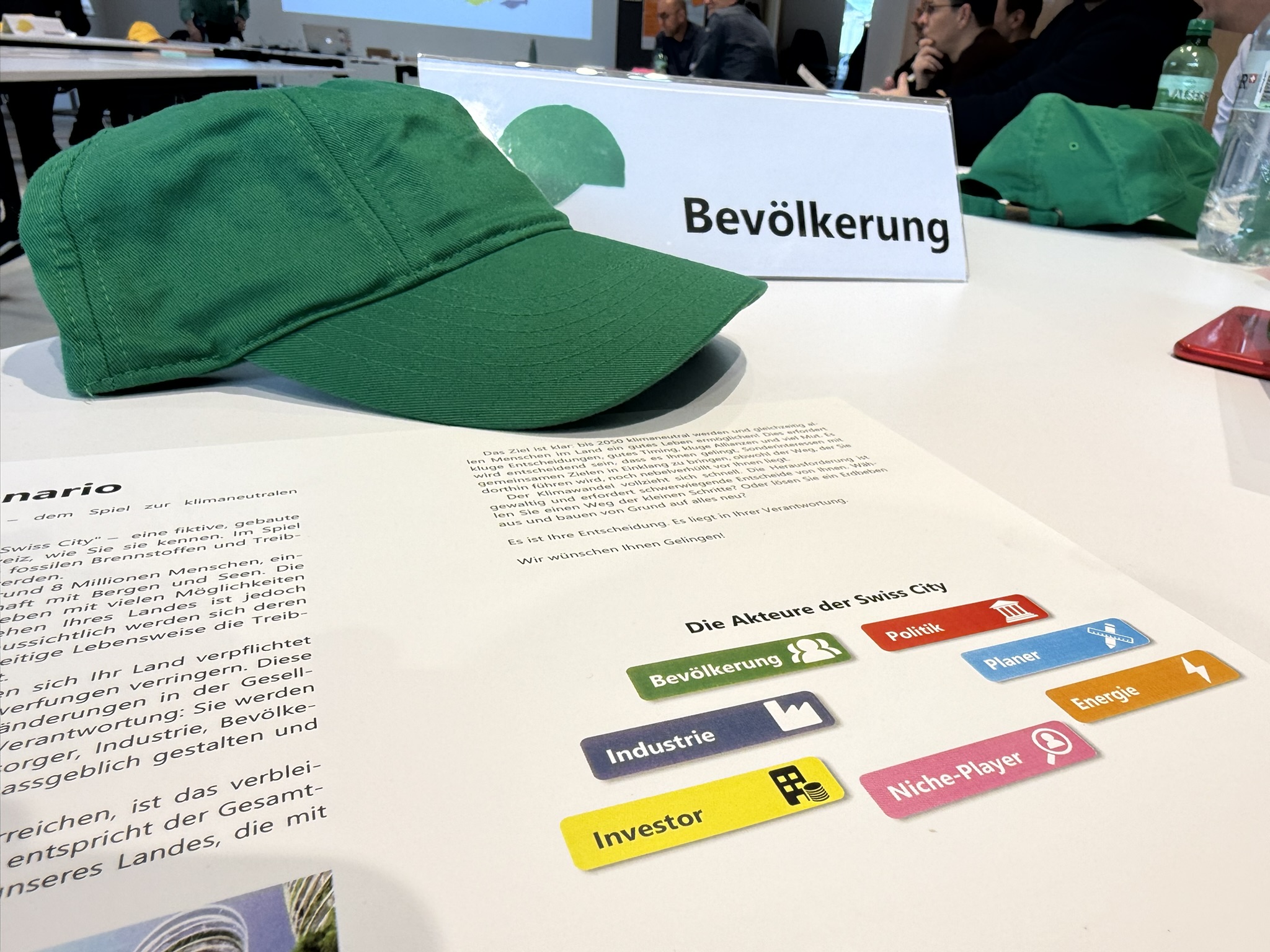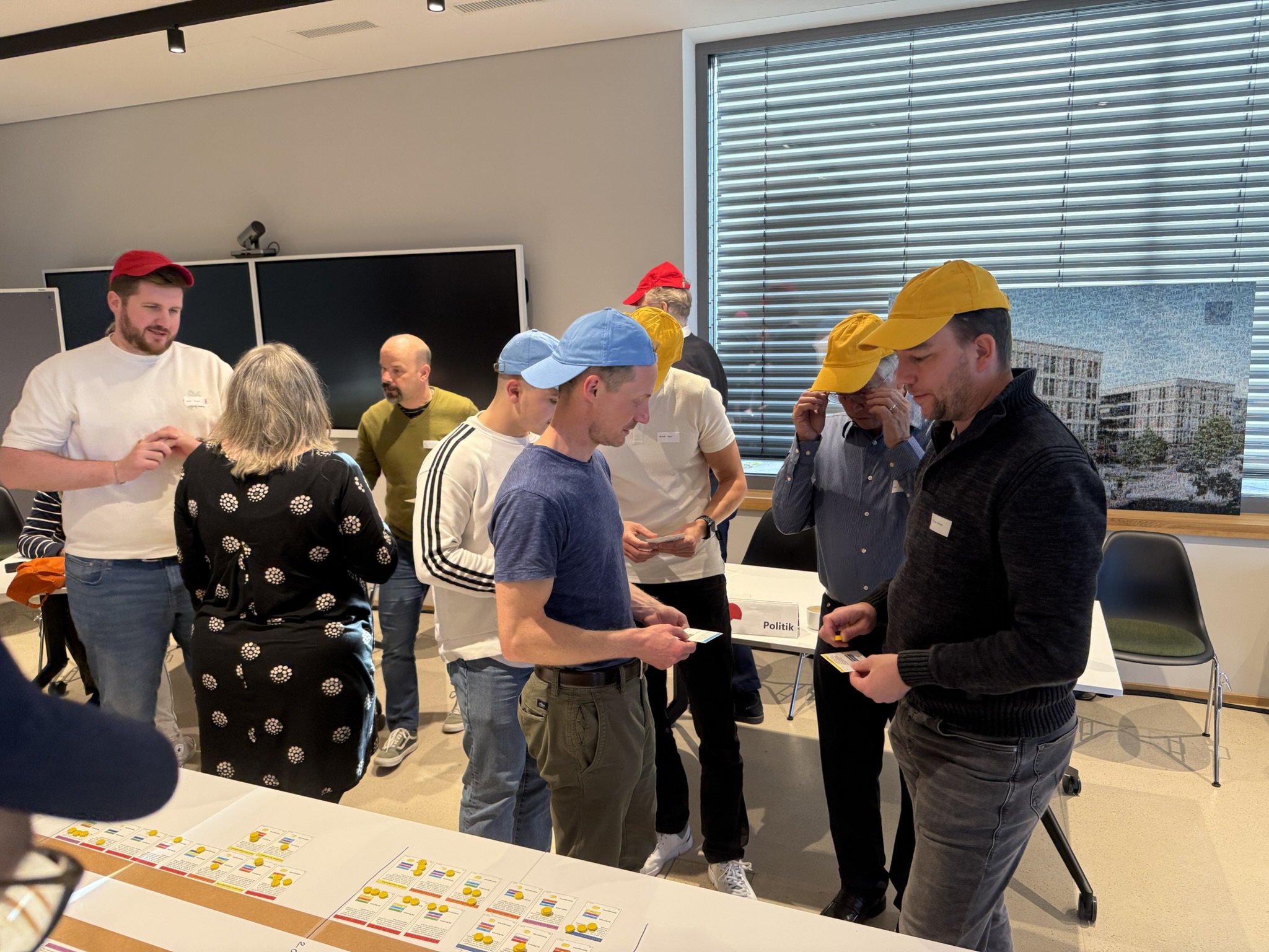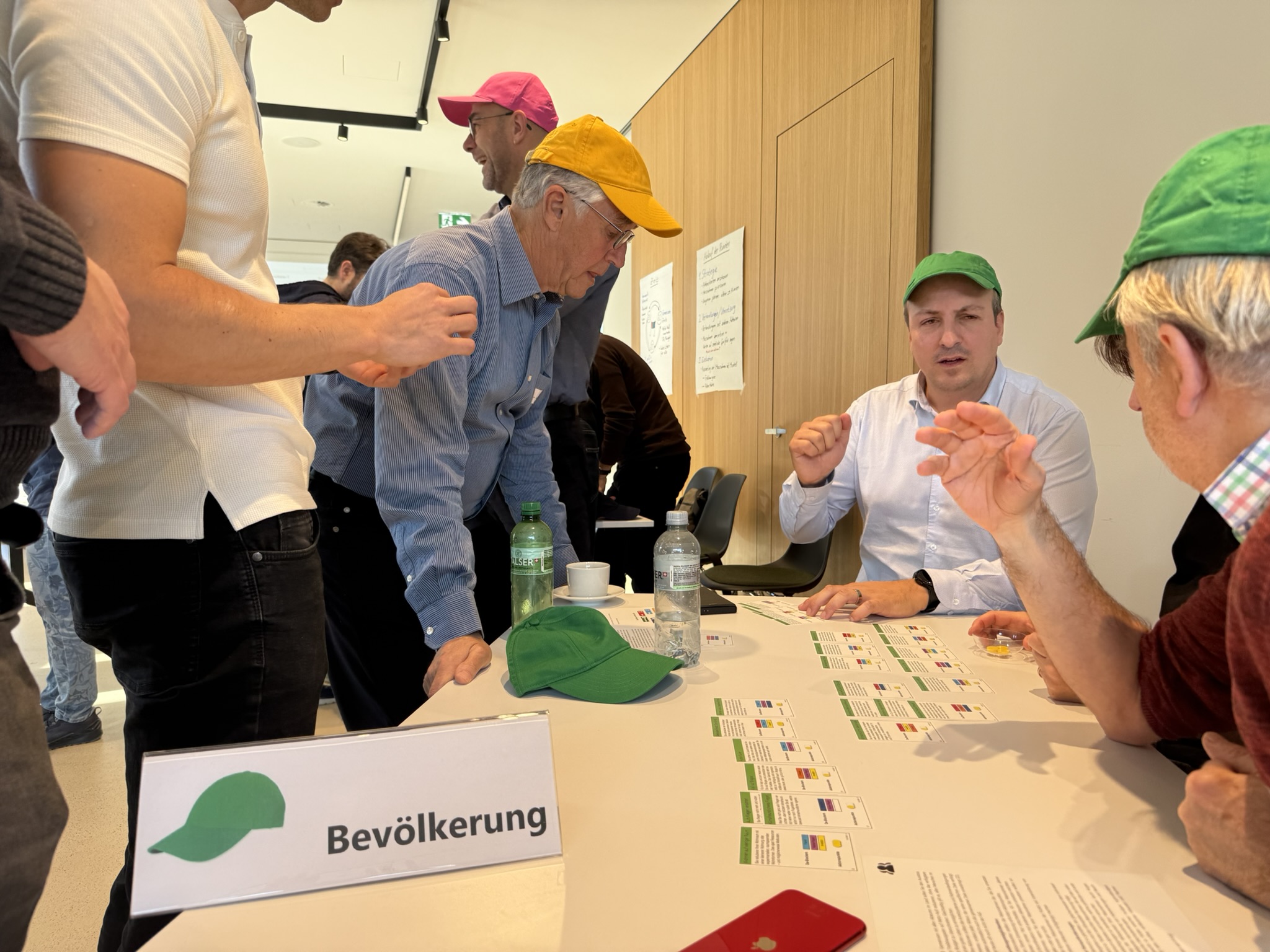 Die Teilnehmerinnen und Teilnehmern nahmen dabei eine für sie teilweise fiktive Rolle als Bevölkerung, Investoren, Industrie, Politik, Energiesektor, Planer und Nischen-Akteur ein – sie setzten sich also sozusagen sprichwörtlich einen anderen Hut als in der Realität – oder eben im echten Leben - auf. Anhand der Cap-Farbe konnten sich die Interessengruppierungen besser voneinander unterscheiden bzw. liessen sie sich bei den nachfolgenden Verhandlungen leichter identifizieren.