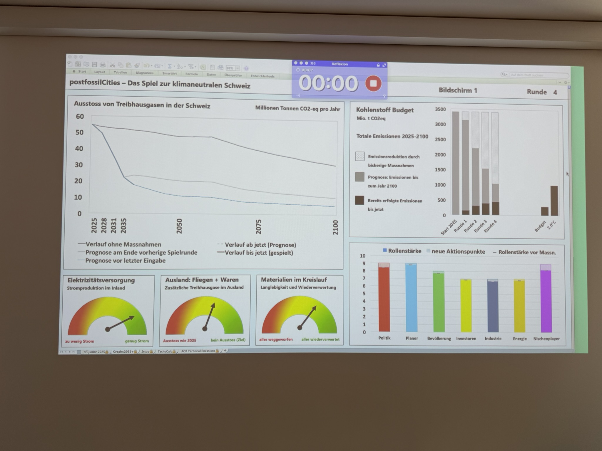 Die im Rahmen mehrerer Verhandlungsrunden bis ins Jahr 2050 gefassten Entscheide flossen direkt in ein Computermodell ein. Die Konsequenzen der getroffenen oder eben nicht umgesetzten Massnahmen, liessen sich 1:1 grafisch an einem Dashboard ablesen – mit Zeitstrahl bis ins Jahr 2100. Auswirkungen auf den Absenkpfad, dessen zeitliche Komponente, und Veränderungen in den verschiedenen Dimensionen liessen sich an Aussteuerungsanzeigen prägnant erkennen. Das Modell basiert auf wissenschaftlichen Untersuchungen der EMPA und auch auf einen Anteil von Aspekten, zu denen Annahmen getroffen werden mussten.