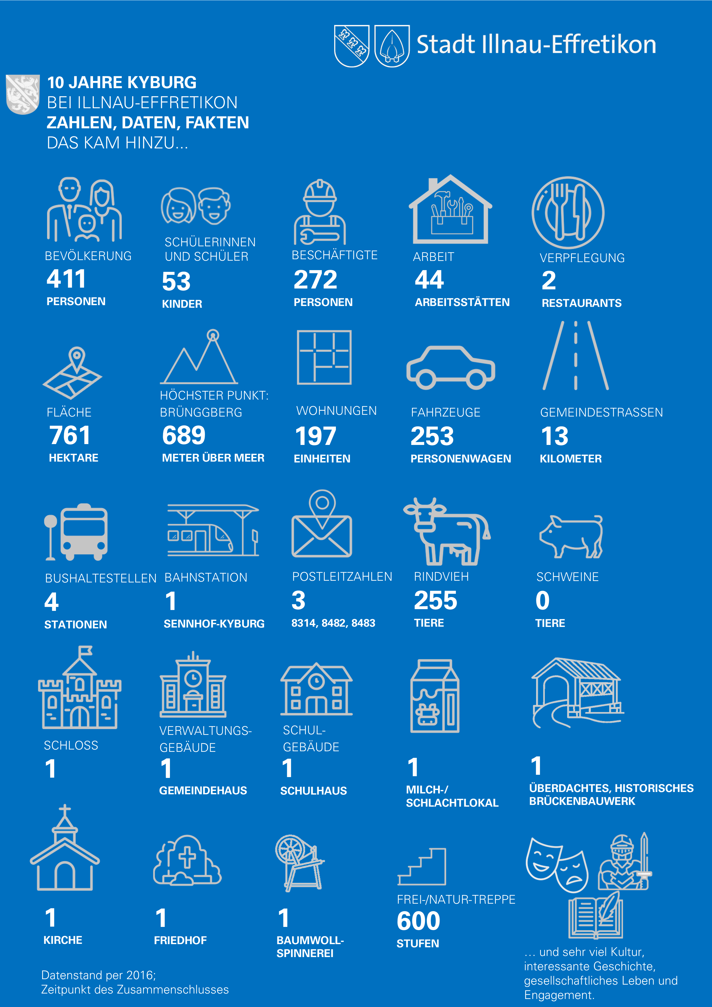 Heute, am 1. Januar 2026, blickt die Stadt auf die bereits zehnjährige, gemeinsam zurückgelegte Wegstrecke mit dem Illnau-Effretikon gewordenen Teil «Kyburg» zurück – und die Kyburgerinnen und Kyburger tun dies natürlich umgekehrt auch: Sie sind seit dem 1. Januar 2016, dem Tag, als der Zusammenschlussvertrag zwischen der ehemaligen politischen Gemeinde Kyburg und der Stadt Illnau-Effretikon formell in Kraft trat, Illnau-Effretikerinnen und Illnau-Effretiker. Dadurch waren sie von den Folgen des Zusammenschlusses wohl am meisten betroffen. Wir lassen den Prozess nochmals Revue passieren: