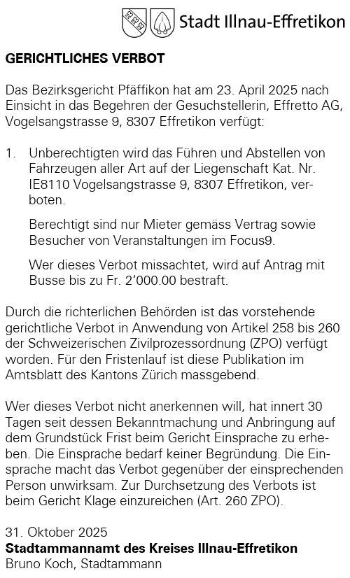 | Gerichtliches Verbot; Vogelsangstrasse 9, Effretikon (PDF, 50.85 kB) | Download | 0 | Gerichtliches Verbot; Vogelsangstrasse 9, Effretikon |