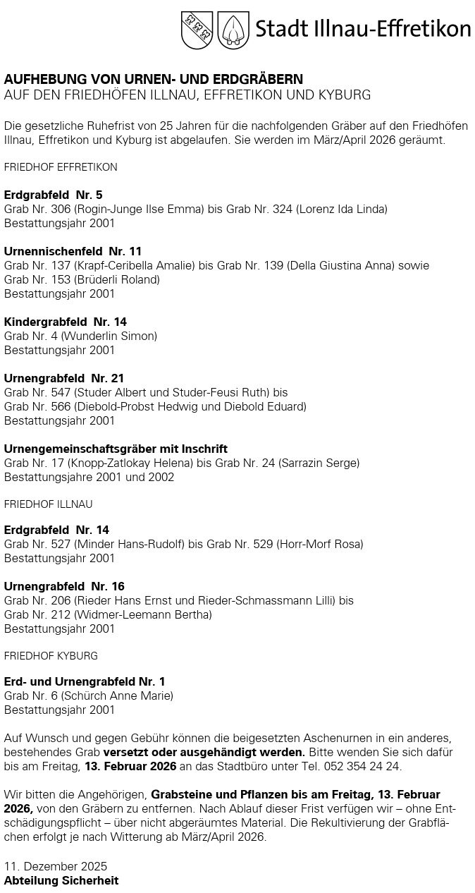 | Grabaufhebungen 2026 (PDF, 63 kB) | Download | 0 | Grabaufhebungen 2026 |